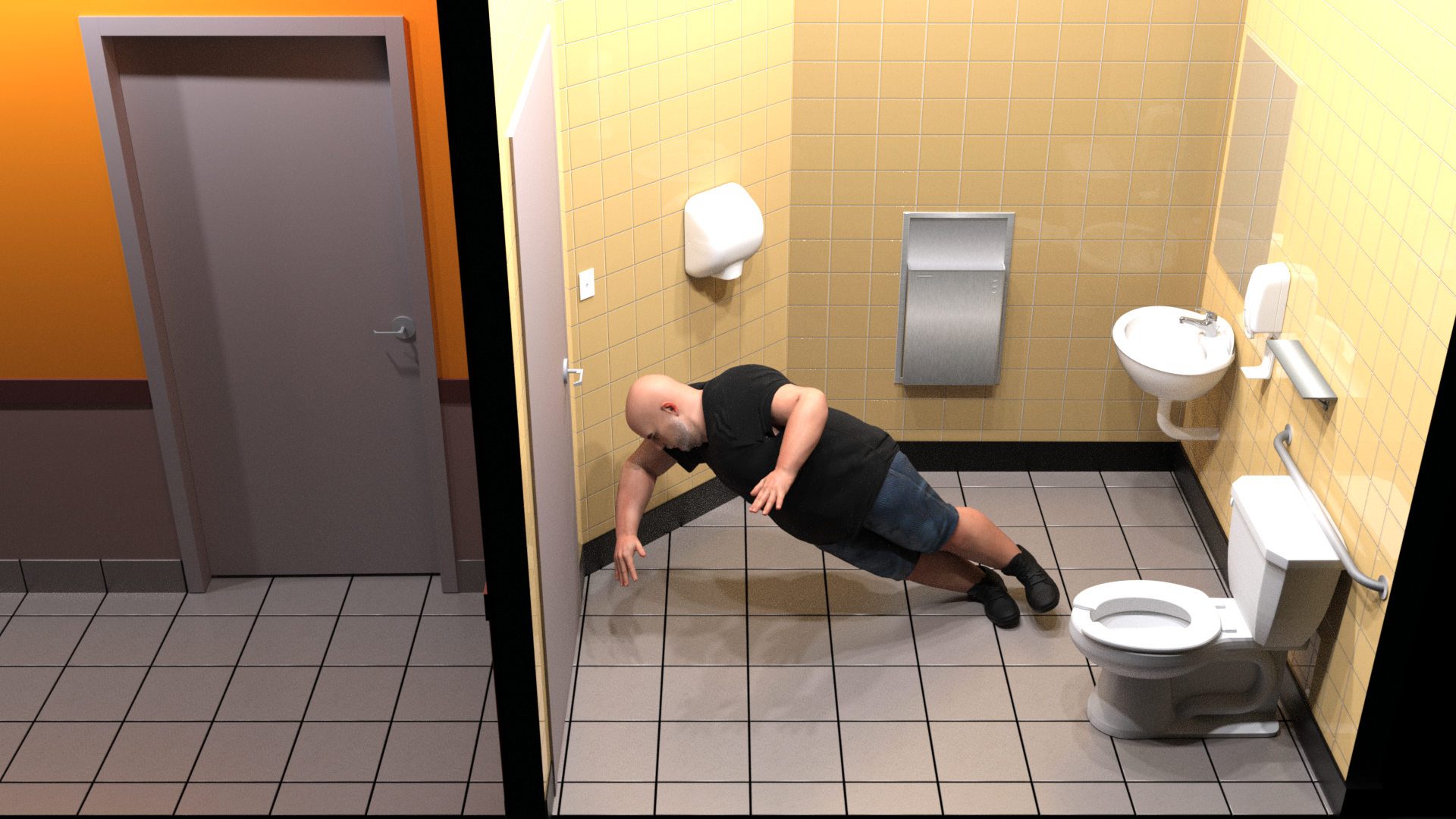 Once a 3-dimensional model is constructed, a character, representing the Plaintiff, can be posed and positioned within the scene in order to illustrate the exact mechanism of the slip and fall event, as well as to illustrate the points of contact between the floor and the Plaintiff’s body.